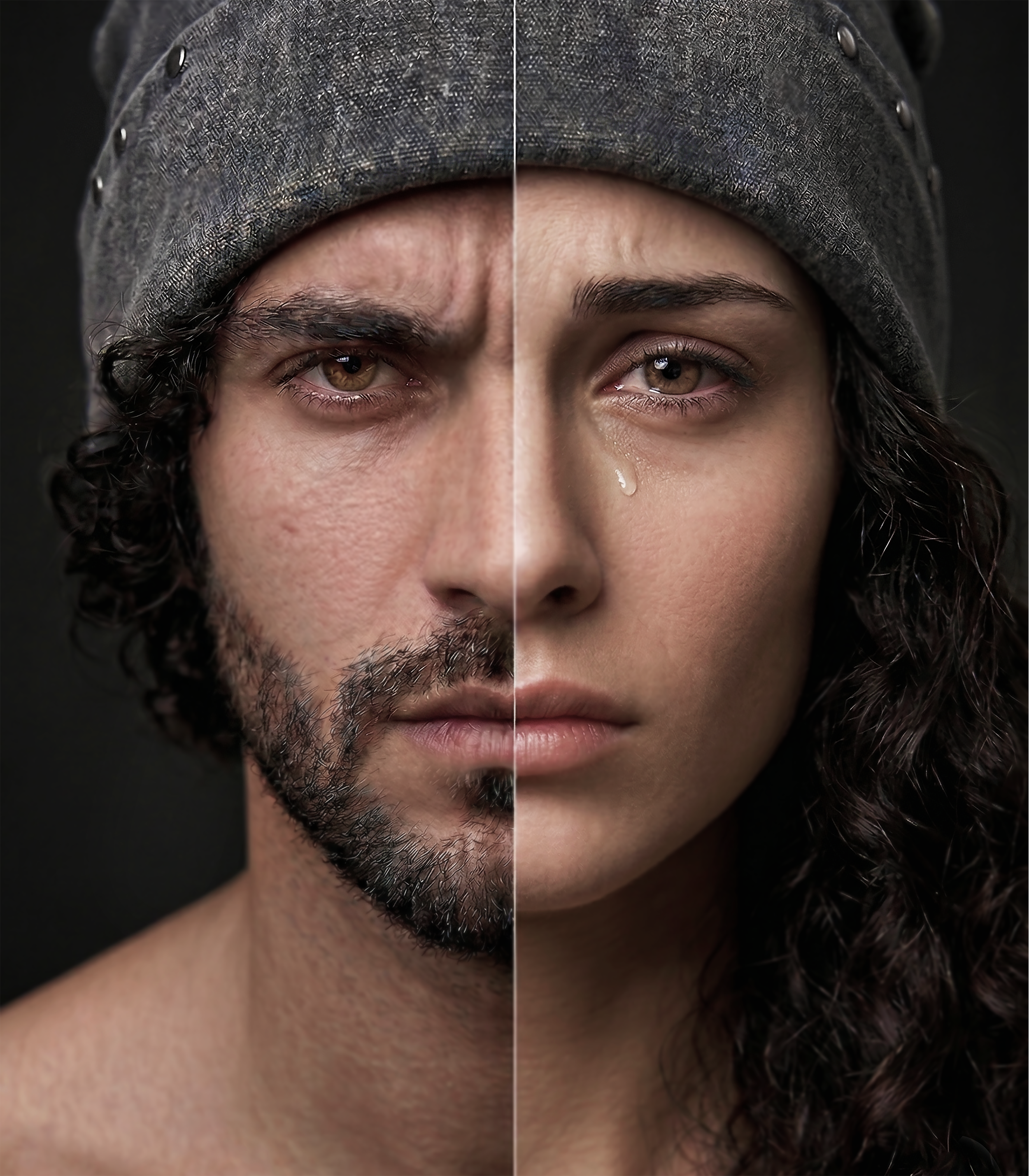 Waar de buitenwereld slechts de harde man als de enige waarheid ziet, blijft de ziel getuige van de zachte man. De realiteit is de wrede aanwezigheid van beide.